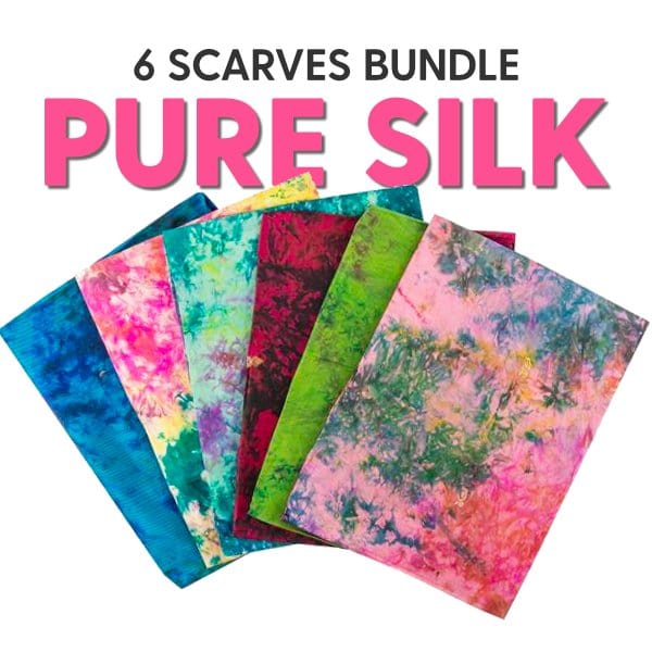 6 x 100% Pure Silk Scarves- Assorted Colours. In this bundle you will receive a hand picked selection of 6 stunning pure silk scarves. Our team make every effort to ensure that you receive a variety of colours/designs.