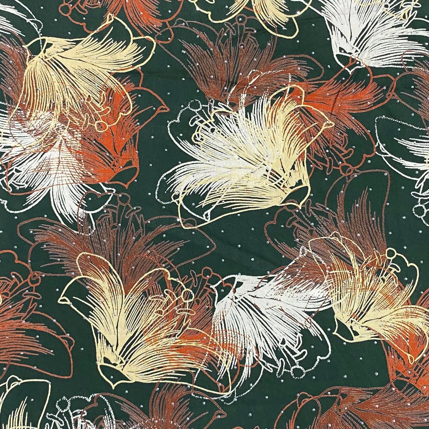 The standout feature of this fabric is its diamante-inspired printed design—a pattern that imitates the sparkle and arrangement of delicate gem motifs. These prints add a touch of sophistication without the use of actual embellishments, keeping the fabric lightweight while still offering a glamorous, eye-catching look. The prints are created using high-quality pigments that deliver crisp detailing, rich tones, and fade-resistant colours suitable for both everyday wear and special occasions.